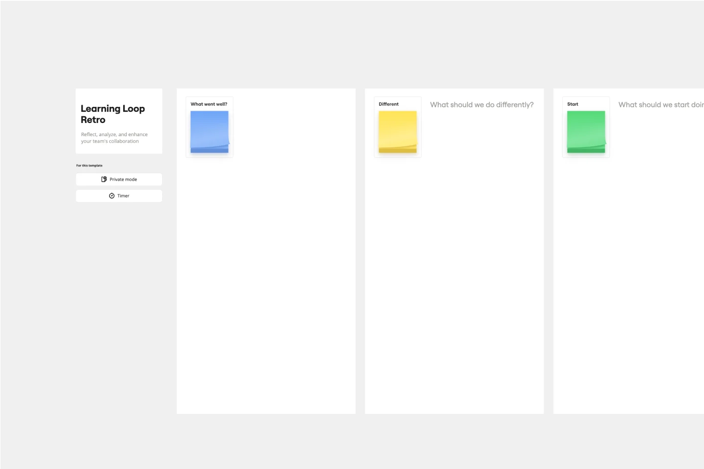 The Learning Loop Retro template is a powerful tool designed to help teams reflect on their projects by recognizing successes and identifying areas for improvement. This template is part of Miro's Intelligent templates, which streamline workflows and keep teams engaged by integrating AI, interactive tools, and seamless integrations. One key benefit of the Learning Loop Retro template is its ability to drive continuous improvement. By regularly reflecting on their work and identifying areas for enhancement, teams can consistently elevate their performance and achieve better outcomes.