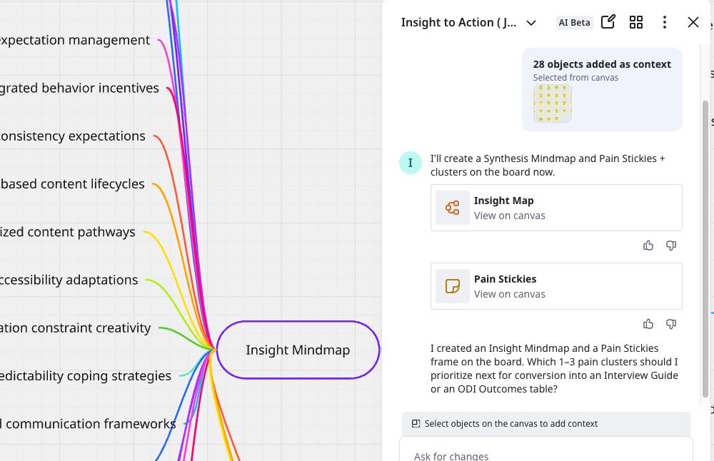 Synthesize interview notes into an Insight Mindmap + Pain Stickies + clusters