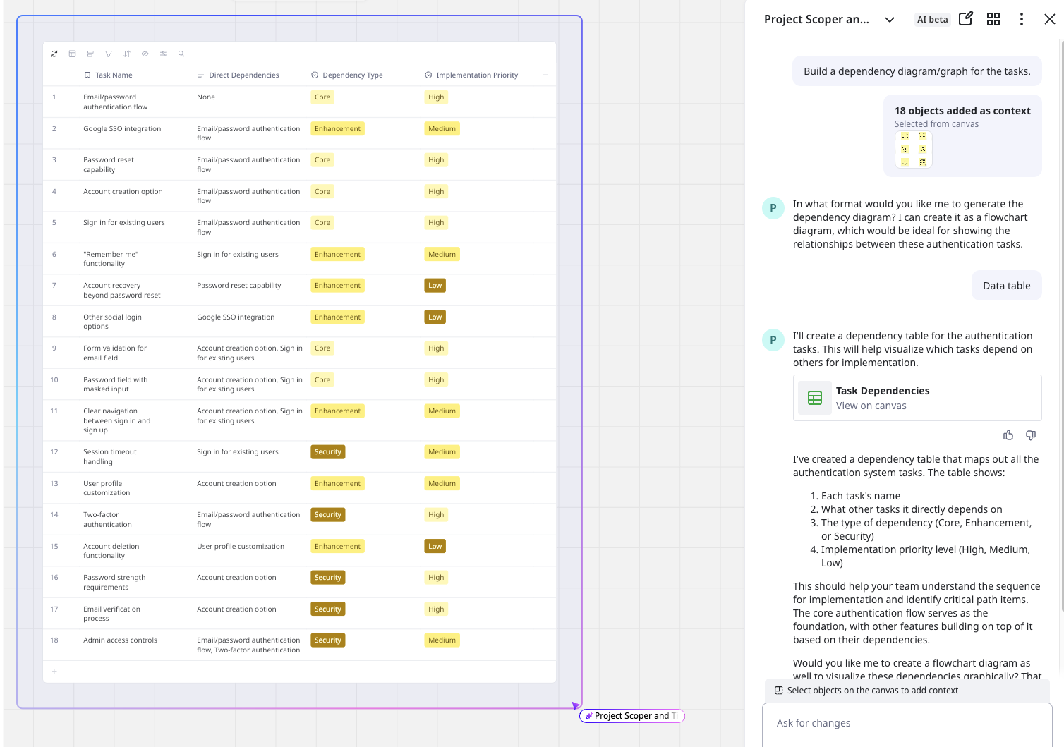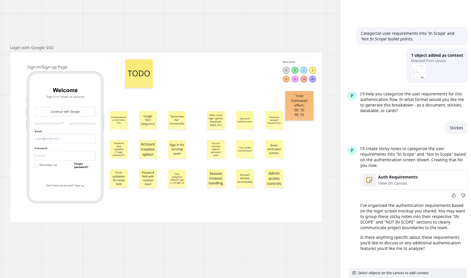 Instead of just summarizing text, this Sidekick analyzes your brainstorming sticky notes, user flows, and architecture diagrams to instantly populate your Project Scope & Timeline. It thinks like a PM who has spent years in the trenches with developers—prioritizing user value while immediately spotting technical dependencies, risks, and implementation details.