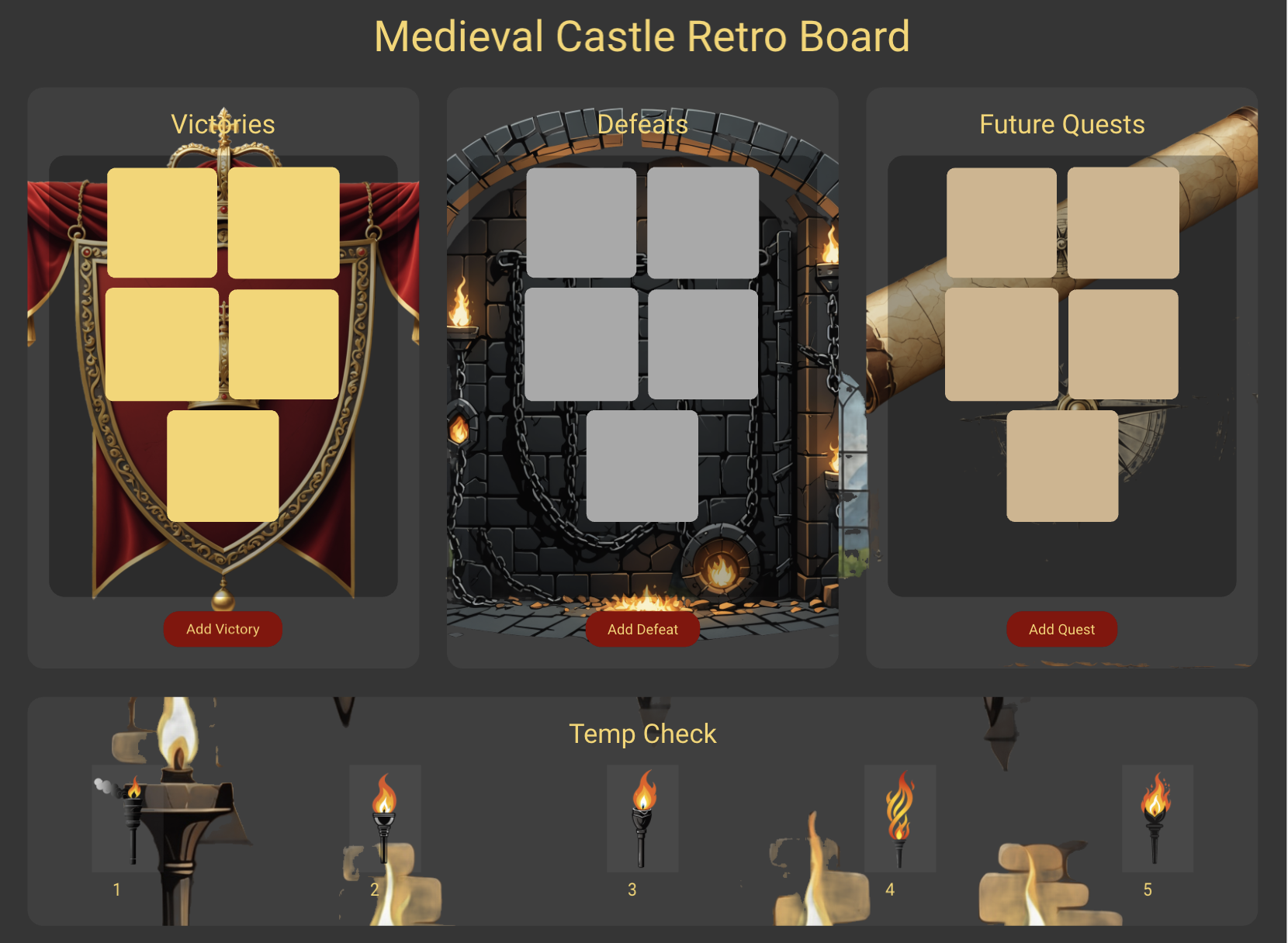 Generate a medieval castle-themed retro with victories, defeats, and quests sections.