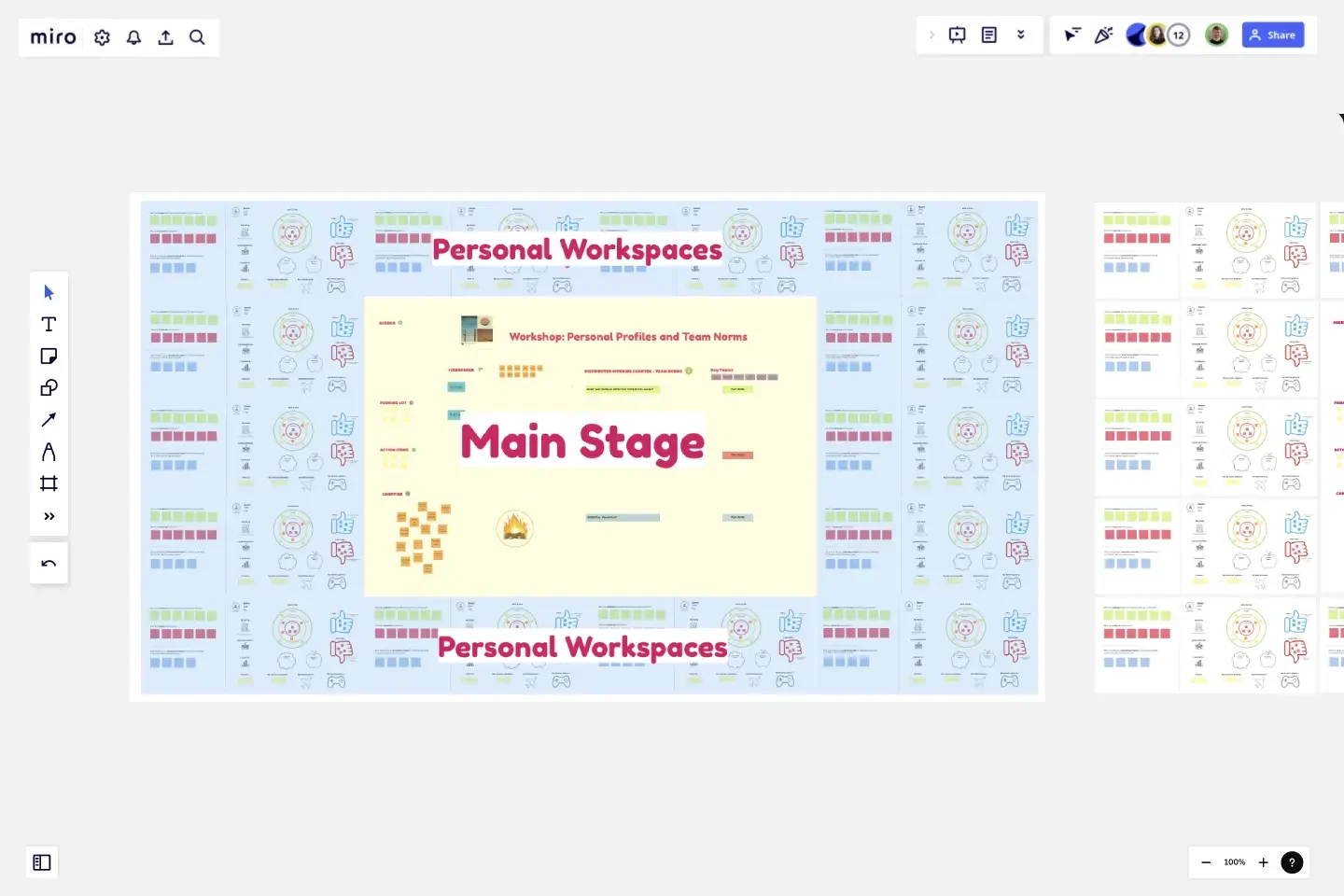 By structuring the board with Personal Workspaces around a Main Stage, you can give your team space to create their profiles and brainstorm norms.Â