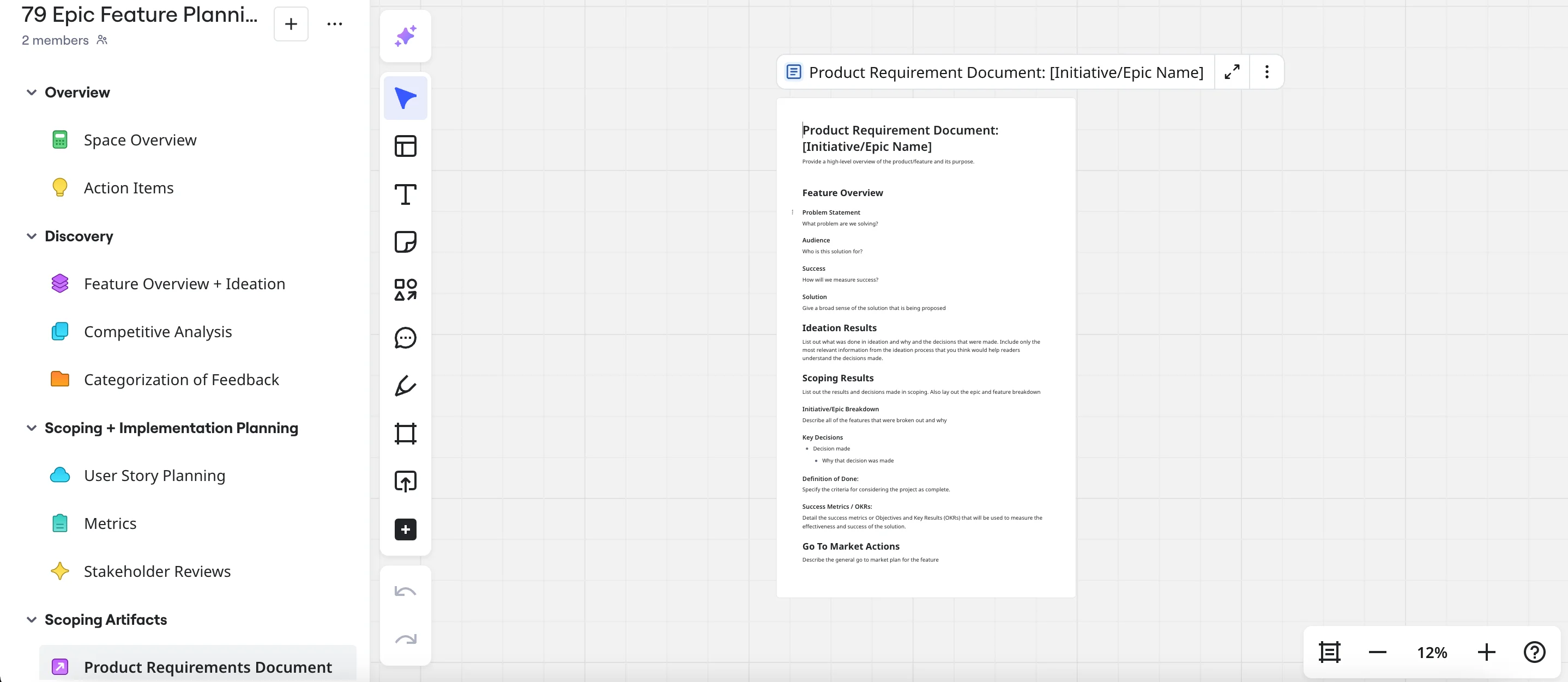 The PRD Template by Miro is a blueprint designed to streamline the product development process. Acting as a central hub for all essential details, this template ensures team alignment by laying out clear project objectives, use cases, and design specifics. The primary benefit? Seamless communication and clarity, reducing the likelihood of missteps and fostering a smooth transition from idea conception to product launch.