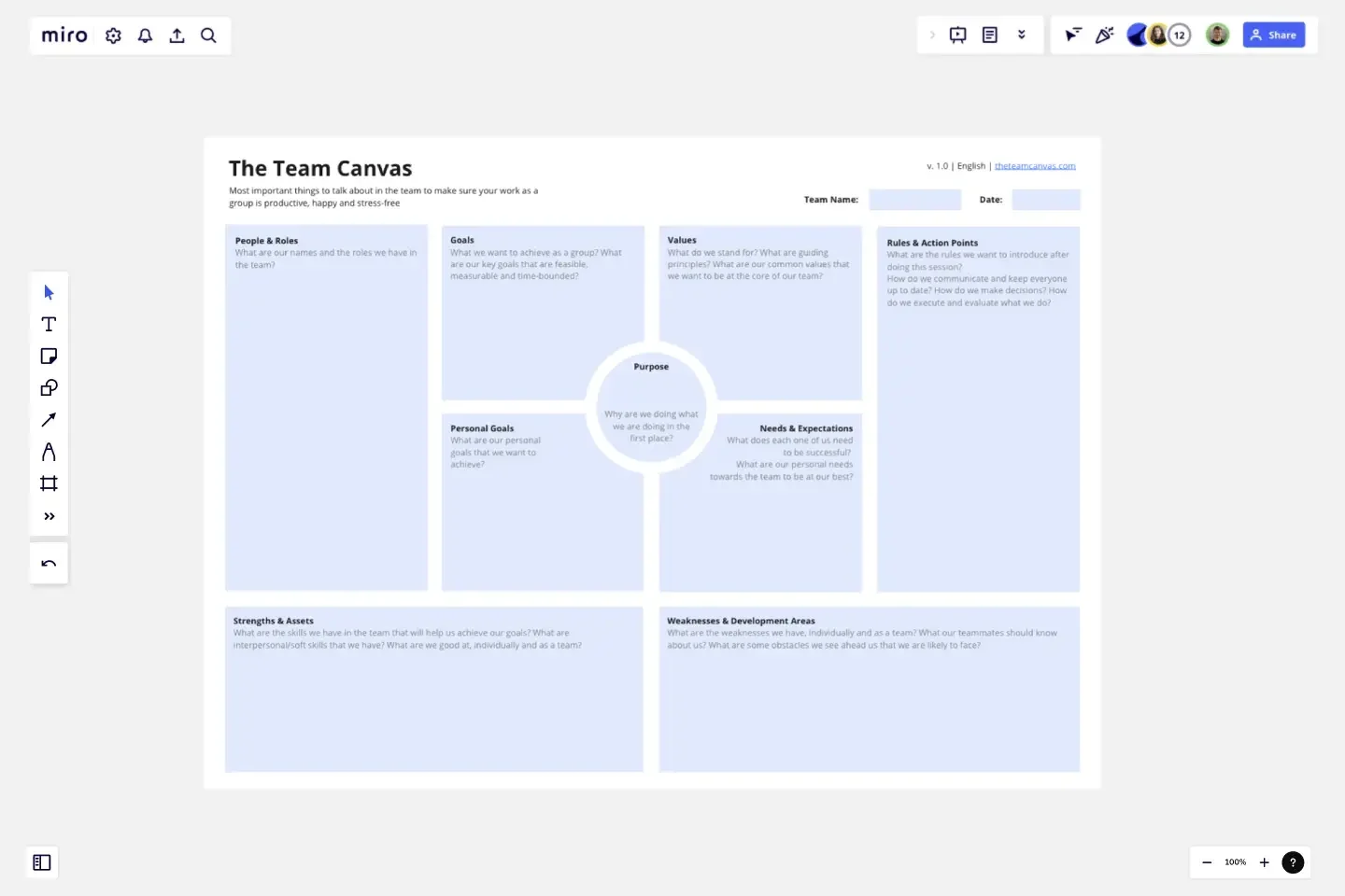 As a leader or facilitator, you experience moments when you need to bring team members together, clarify their goals, figure out their motivations and help them to be more aligned and productive. Use Team Canvas to start a structured conversation with the team and bring everyone on the same page.Â