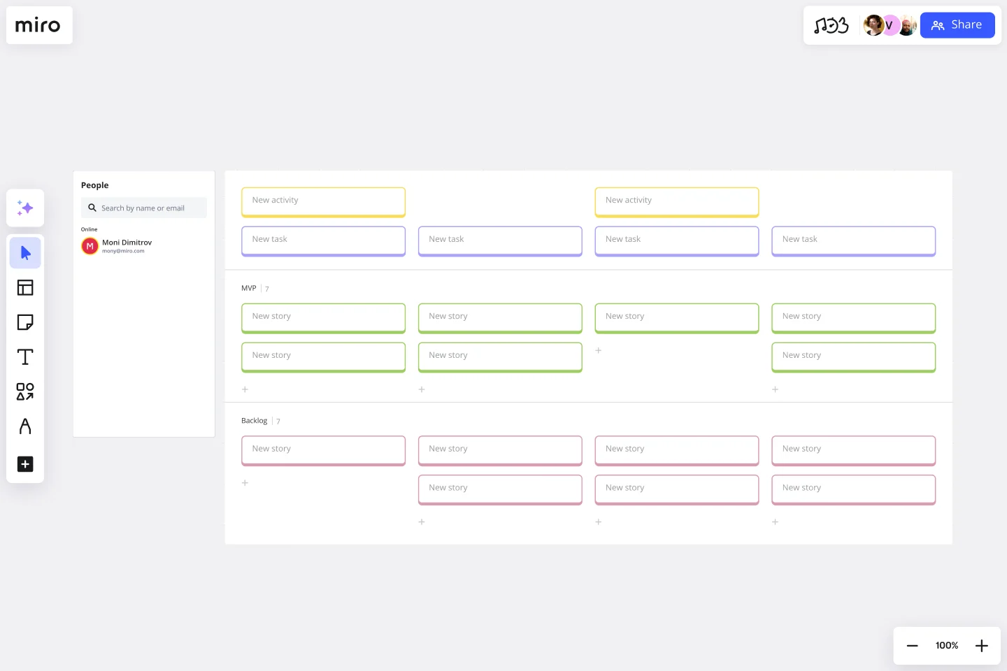 Miro’s user story mapping template allows you to manage stories collaboratively online. Here’s how to create your team canvas and put it to work:
